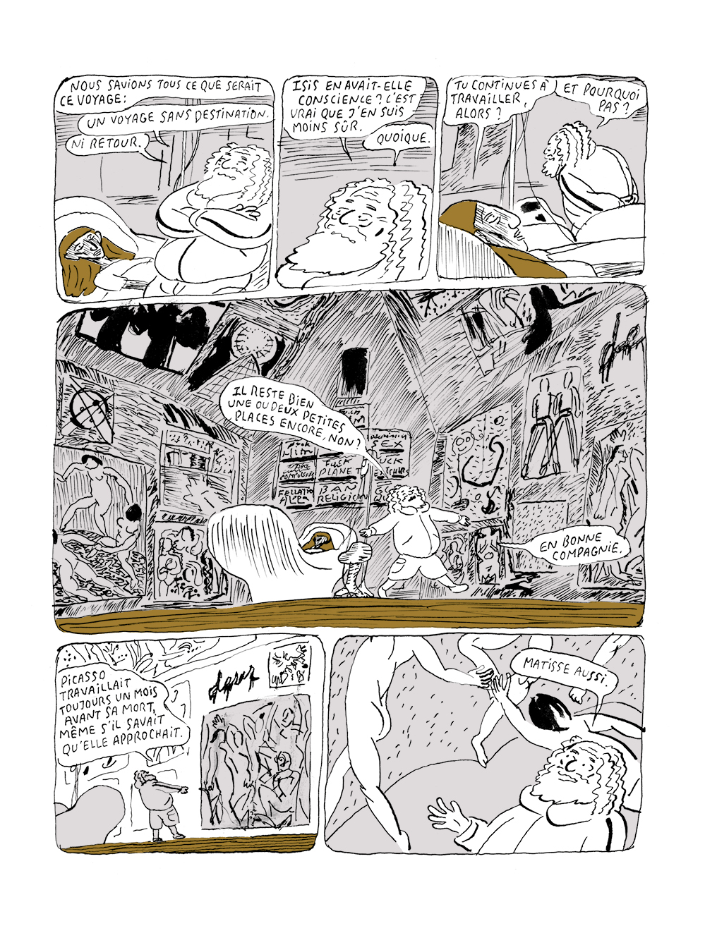 Isis trompe son inquiétude et son ennui en discutant avec les autres passagers : Bernard guide l’enfant, à la demande de la vieille femme, à travers la formidable collection… Francis Picabia, Annette Messager, Picasso, Louise Bourgeois : quel rôle, à présent, pour ces œuvres, ces vies, ces histoires ? à quoi bon l’Art, dans ce monde en ruine ?
