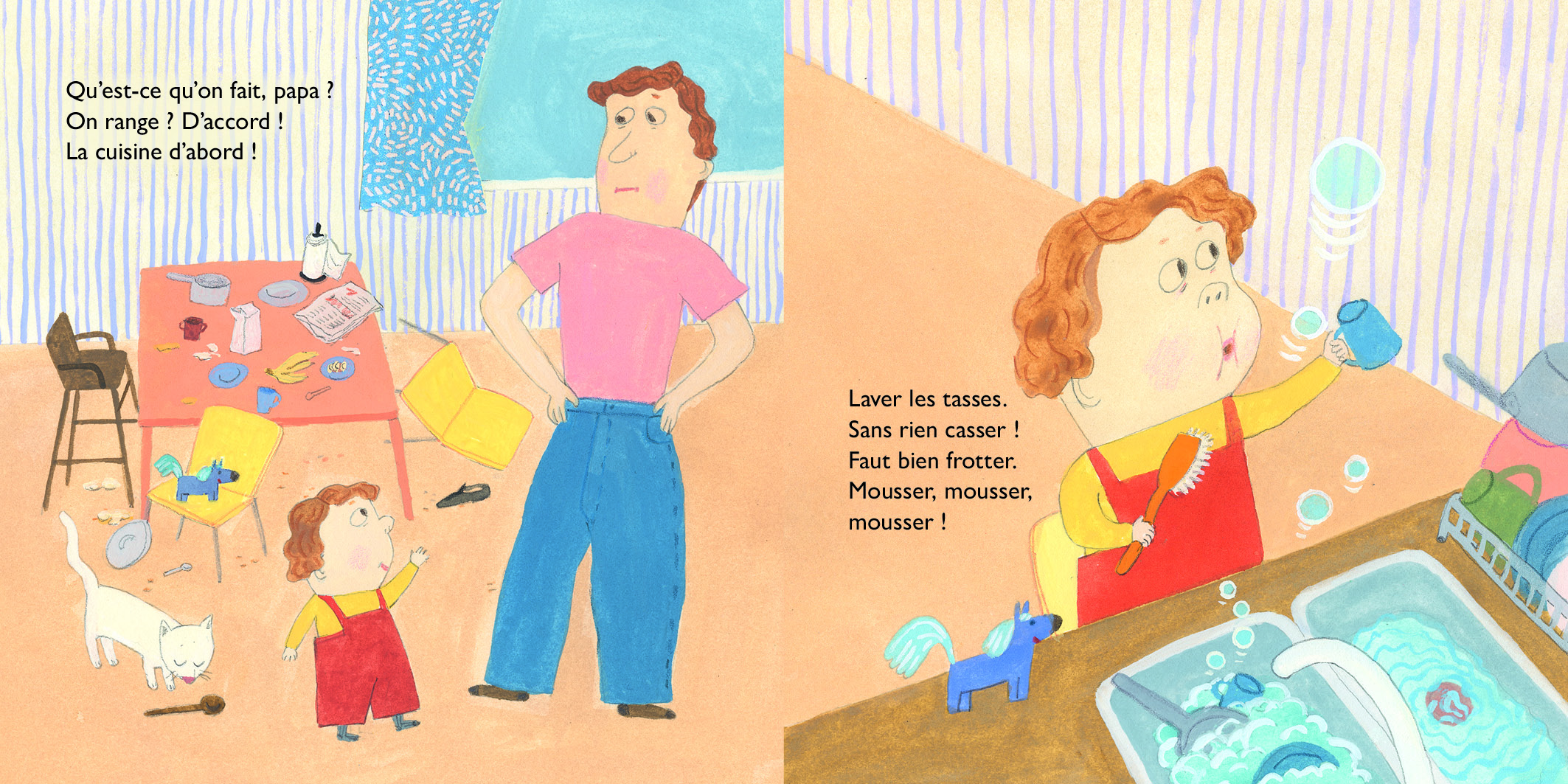 Résumé : Un texte comme un poème pour raconter une scène quotidienne entre un enfant et son papa. Pour les tout-petits, faire le ménage peut être une fête et une aventure ! Les illustrations expressives de Sara Gimbergsson apportent humour et douceur à ce délicieux livre tout-carton. Sortons les chiffons !